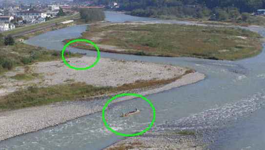 窓から川を見下ろすと、船下りの船が下ってきます。