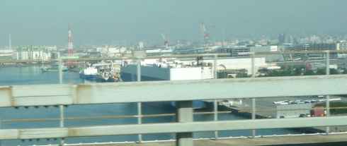 湾岸線から港を見下ろすと、自動車運搬船が来ています。