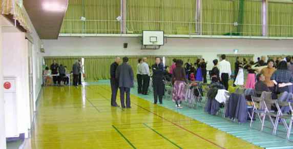 体育館ではお年よりたちが駐車場の案内をしてくれます。