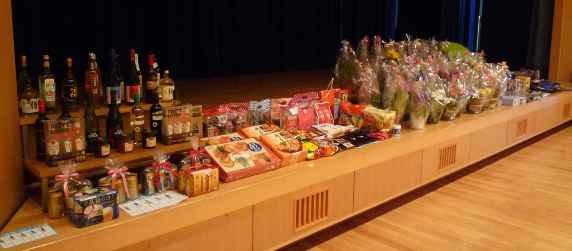 正面の舞台に並んでいる物は今日のくじ引きの賞品で、好きな物を持ってゆくのだそうです。