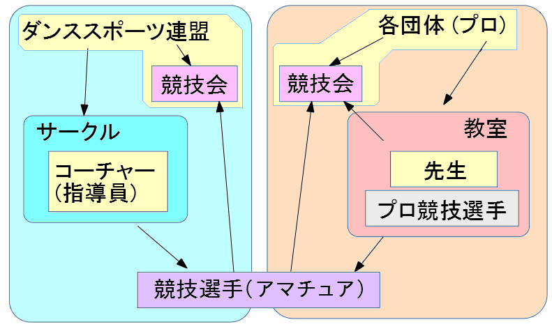競技会を主催する団体のうち、アマチュアの団体はJDSF (ダンススポーツ連盟) のみです。