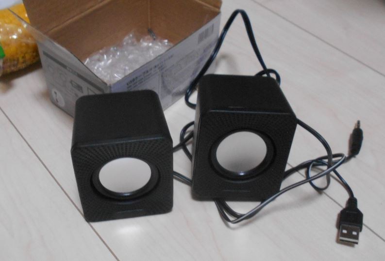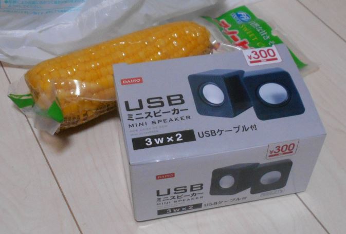 パソコンから出せる音は小さいので、ダイソーのスピーカー (300円) を使ってみました。