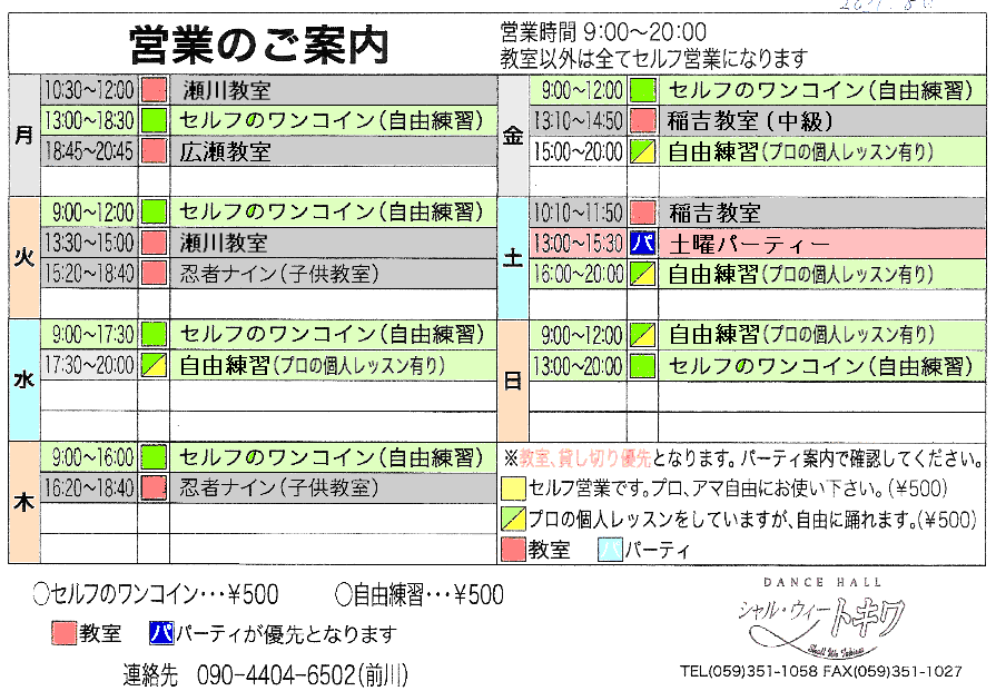 12月から、水曜日午前中、教室が開催されるため、自由練習は出来ません。