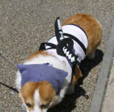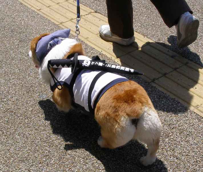 子供たちばかりではありません。 このワンちゃん、忍者の衣装でお散歩。