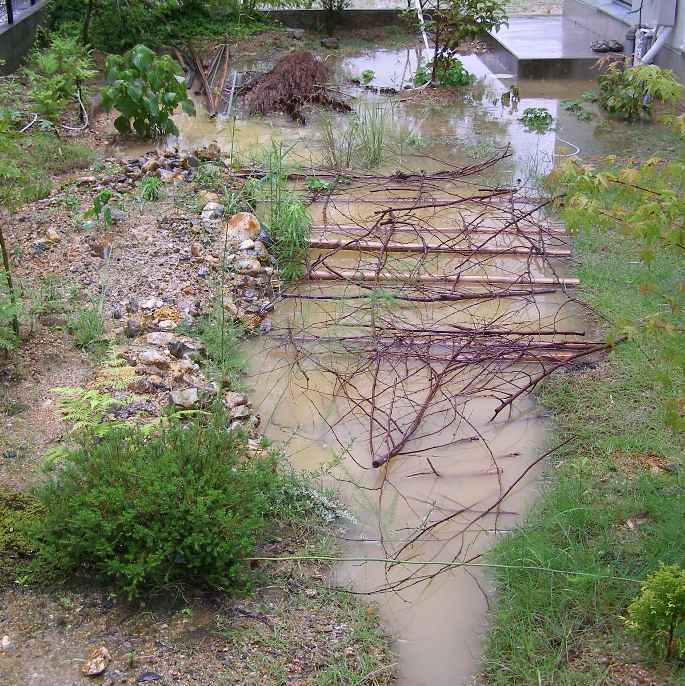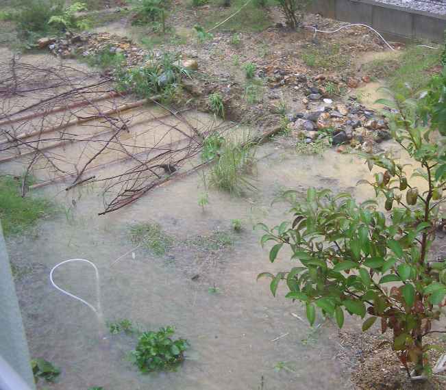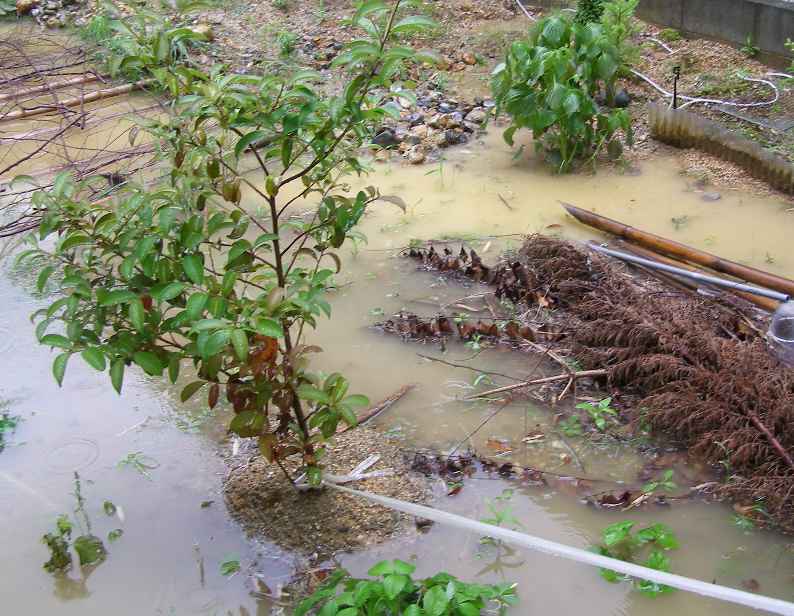 10分ほどで池が溢れ、庭は水浸しになった。