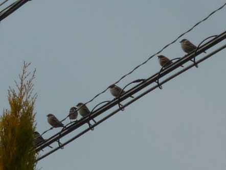 消防車を見下ろしているスズメたち。