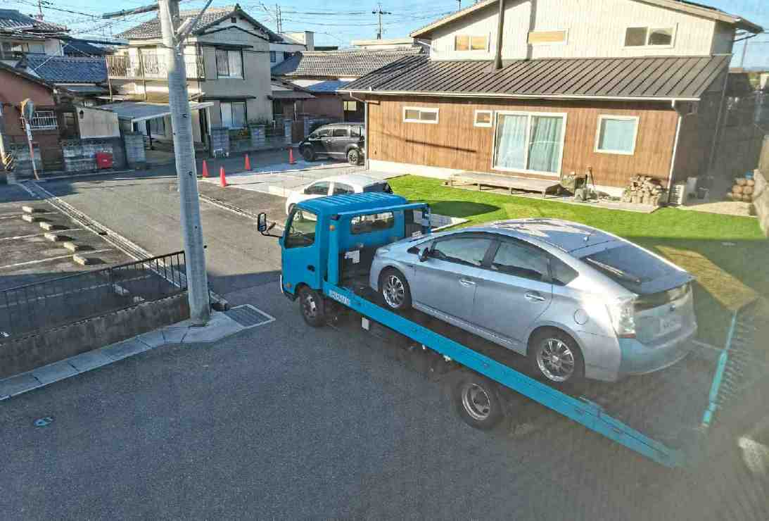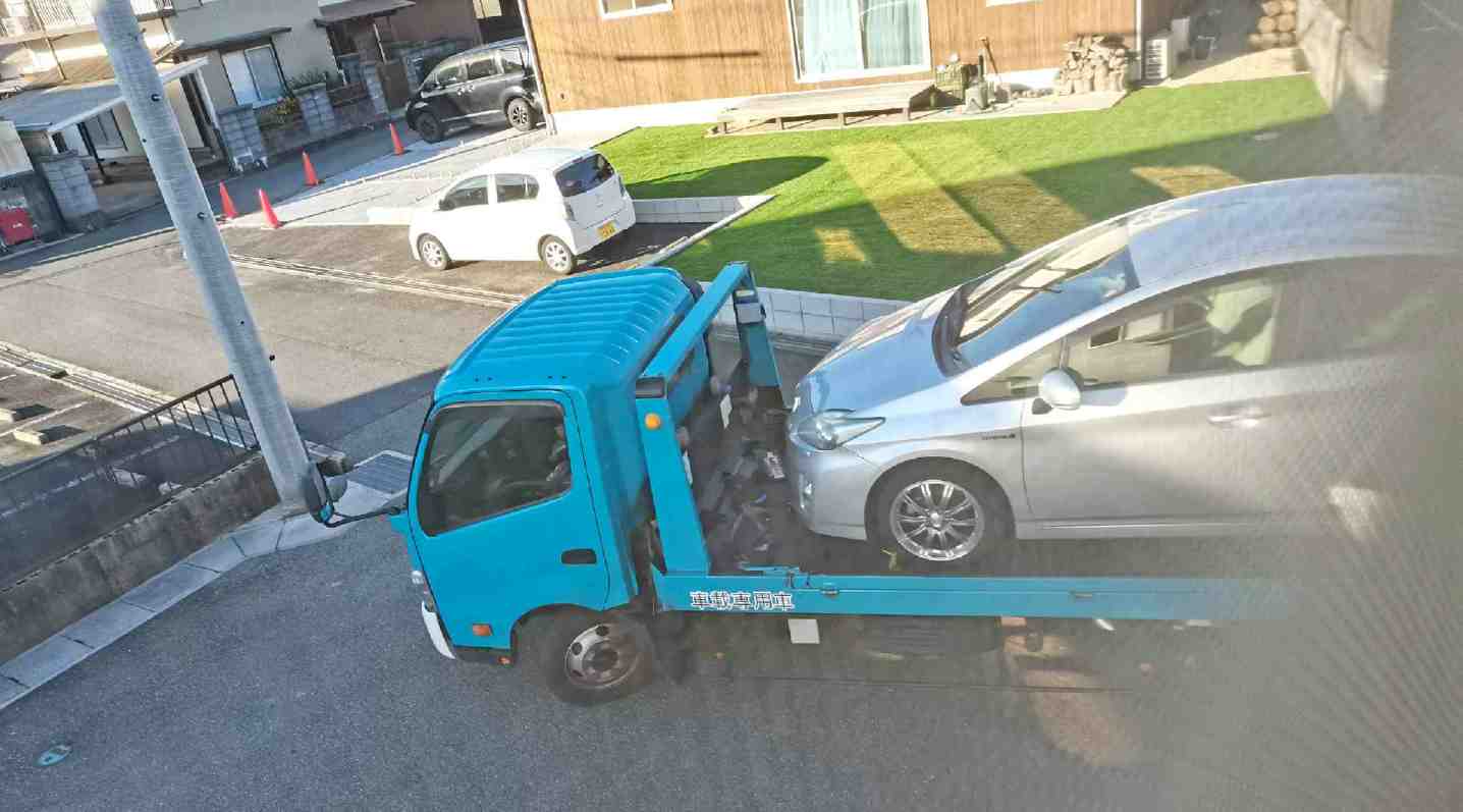 外がうるさい。 見るとプリウスを積み込んでいる。