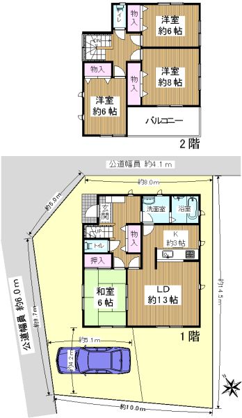 | 接道状況 | 角地・北4.1m(公道)接面8m/西6m(公道)接面9.7m | ||