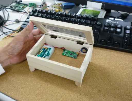 昨日、甲南のセリア ( 100円ショップ) から買ってきた箱に組み立ててみた。 スピーカーを後ろ向きに取り付けたら、音が後ろに出てしまう。 スピーカーは手前を向けないとダメだ。 音が小さい、と思ったら、 デザイナーから、内側に貼ってあるコルクが音を吸収するからだ、と言われた。 なるほど、そうかもしれない。