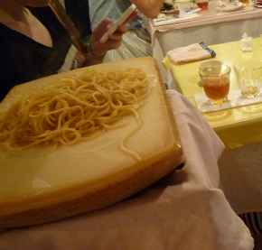 巨大なチーズの上にパスタを載せてチーズを絡めてくれます。