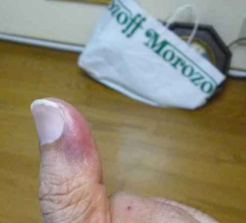 急に戻って親指と人差し指に怪我。