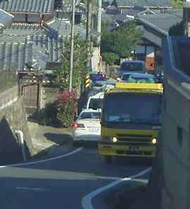 不法な大型車の通行は後を絶たず、時々このような渋滞を引き起こします。