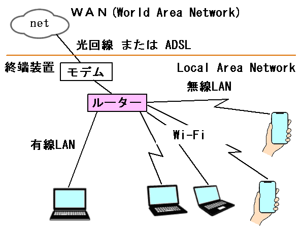インターネットを利用するにはネットと自宅などを光回線またはADSLなどで接続します。