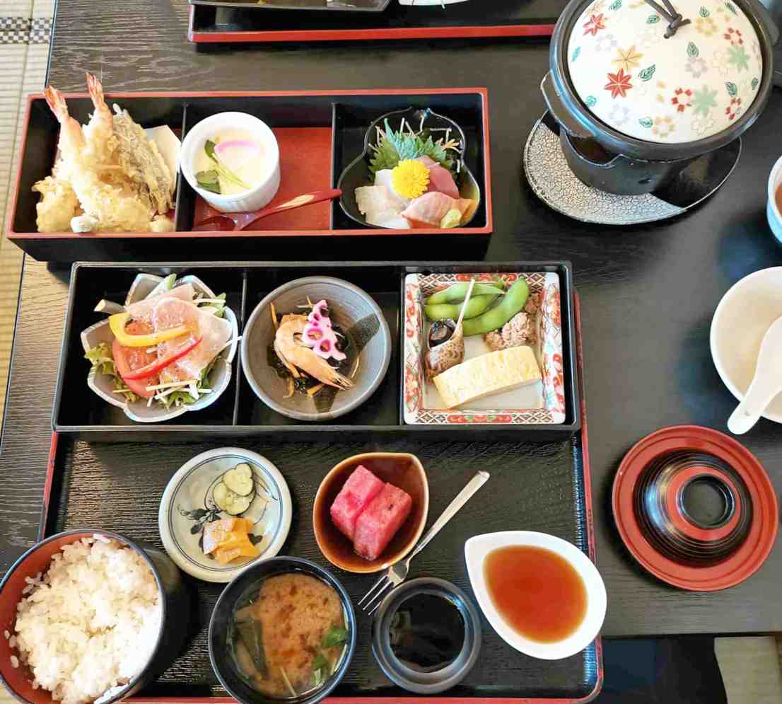 牛鍋、刺身、てんぷら、茶わん蒸し。