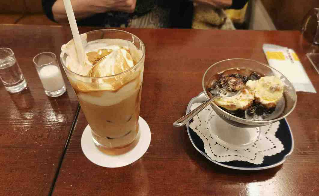 黒糖のお茶、コーヒーゼリー、どちらもおいしい。 お茶には大きな氷が入っていて、冷えた。