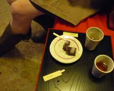 車を停めると係の方が確認に近寄ってきます。 そして、この古民家で受付を済ませ、お茶とお菓子をいただいて待ちます。