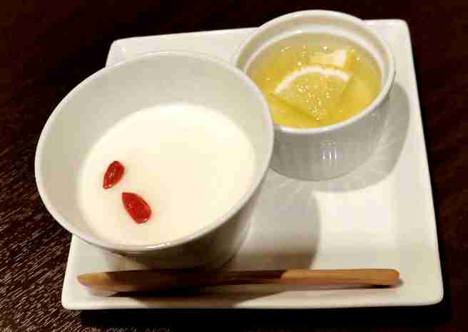 最後に杏仁豆腐と寒天ゼリーが出ておしまい。 デザートのゼリー以外は昨年と全く同じでした。