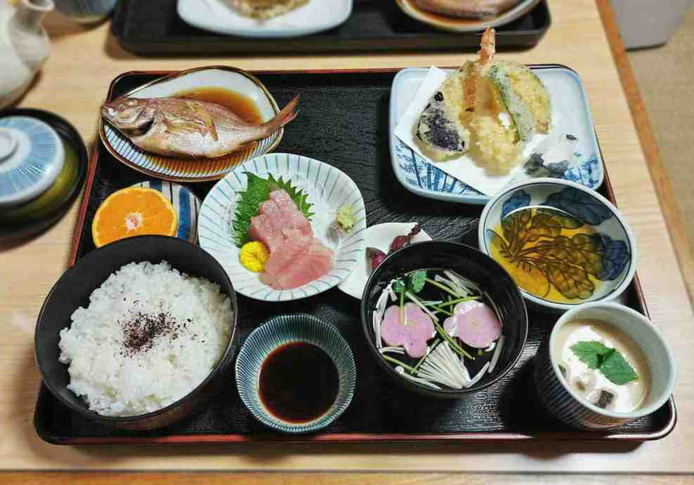 煮魚 (鯛) 、天ぷら、刺し身、どれも
