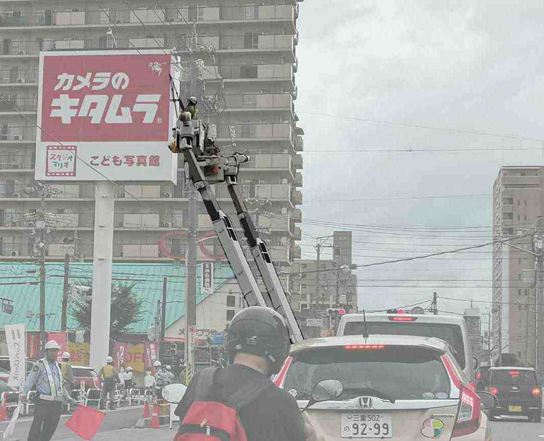 している。 結構高いところで何やら絶縁ハサミのような物を操作?