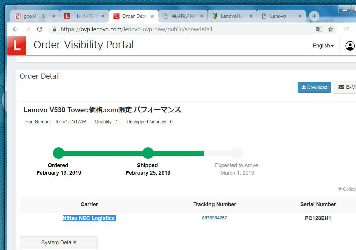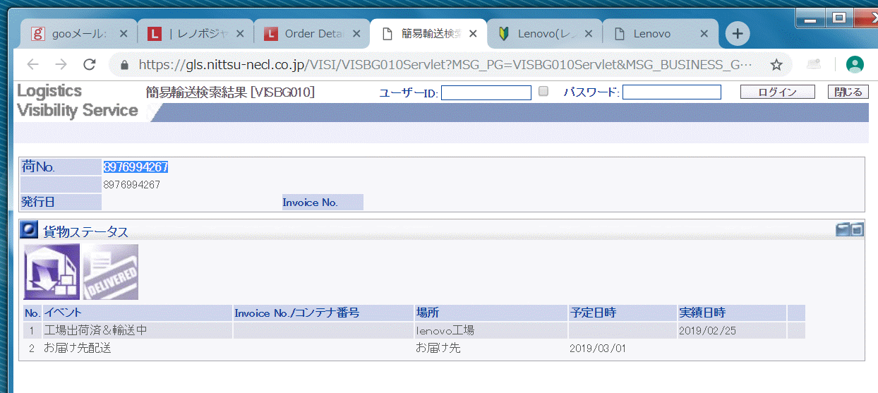 Lenovoから来た受注や出荷案内のメールに記載されたアドレスでは
