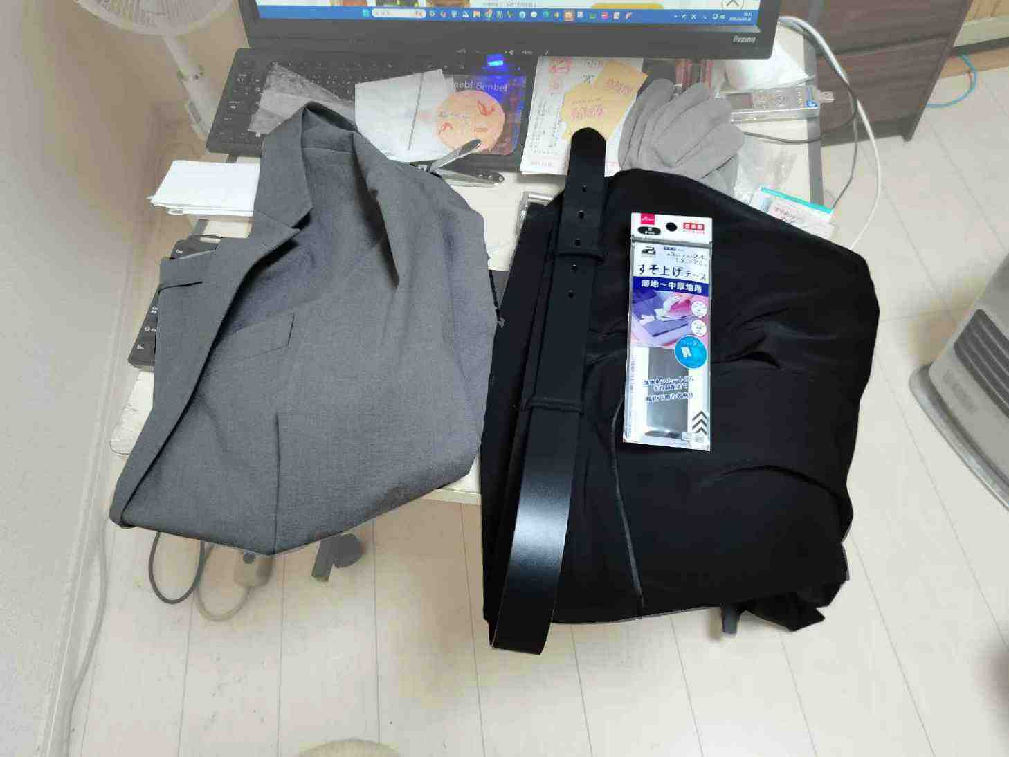 中華ズボンの丈を、裾上げテープで丈を合わせた。 それでも、そのまま履くと長い。 ウエストが落ちる。