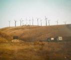 - なんだ? サンフランシスコからヨセミテ公園へ向かう観光バスの中から撮りました。山の上に見慣れない物が何百、何千と並んでいます。手前の道路を走るトラックと比べて見ればわかると思いますが結構大きな物です。これは風車なんですねぇ。風車で電気を作っているのです。究極のクリーンエネルギーですねぇ。
