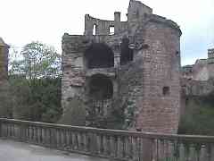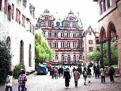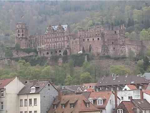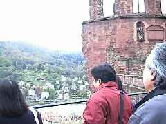 小雨がぱらつくあいにくの天気の中、まずバスでハイデルベルク城へ登りました。 ホテルからはバスで5分程度です。 街の奥にある山の中腹に古いお城があります。 赤茶けた砂岩で作られたお城はずいぶん傷んでいるようです。 どうしてこんなもろい材料で作るんでしょうね?