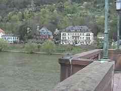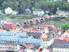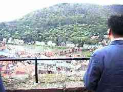 城の入り口は山側です。こちらから見ると城の向こう側が正面玄関ですから、こちら(川)から見上げると城の裏側を見ている事になります。手前の町は当時の面影をそのまま残す古い町並みです。この町は町全体が大学となっているそうです。 この橋は石で出来た狭い橋です。車も通っています。中世には馬車が通っていたんでしょうね。橋の反対側を見ると右の写真の様な高級住宅街となっています。