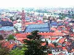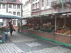 ←マルクト広場 橋と城の間には城下町があります。 どこの街でも街の中央にはマルクト広場(英語ではマーケット広場)があります。 本当に朝市の様はお店が出ています。 ここでハムを買いました。 ここから川下に掛けて大学の建物や教会などが点在しています。 大学の建物は街の建物と混在しており、大学と街の区別はできません。