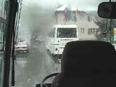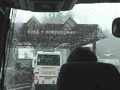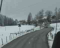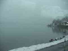 バスから連絡してあったのでしょうか? 我々が着いてから、バスがもう1台来ました。 そのバスも、日本人の団体客でした。 晴れていれば湖の向こうに素晴らしい山の景色を見られるそうですが、 雪が降っていて、な〜んにも見えません。 すでに薄暗くなっています。 村のおみやげ物やさんで 『 万能ナイフ 』 を買ってホテルへ急ぎます。