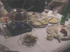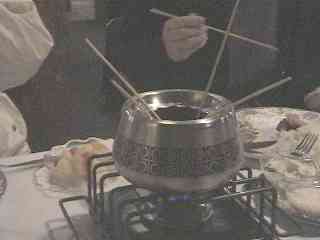 時間はすでに7時、雪はしんしんと降り続いています。 これじゃぁ明日の登山はダメかもしれませんね? 時間はすでに夕方7時を過ぎていますので、ホテルに着くと部屋へ入る前に、 とにかく夕飯を食べる事になりました。 今夜のメニューはスイス名物のフォンデュです。 煮えた油の中に串刺しの肉を入れる物で日本のしゃぶしゃぶを油でやるって感じです。 おどけた感じのウエイターが 『 1〜2分ね〜 』 と言っています。 どこへ行っても日本語で話しかけて来ますね。 日本人の観光客が目茶多い、と言う事でしょうか? 部屋へ向かうと、お向かいの部屋は福島のアツアツカップル中村さん夫妻です。 奥さんが 『 今夜は赤ちゃんを3つ子で作って団子3兄弟を産むんだ〜 』 なぁんて言って ふざけているので、旦那さんが後ろから心配そうに見ています。 楽しいカップルですね。 部屋は広くて快適です。 とにかく疲れたぁ。