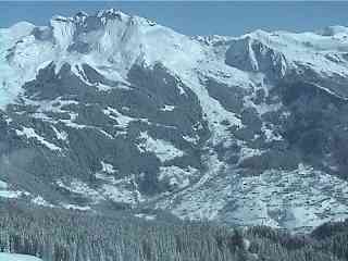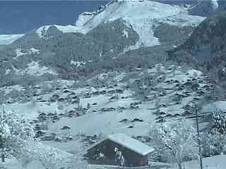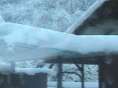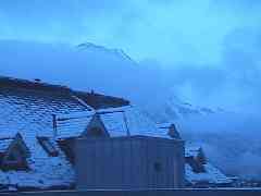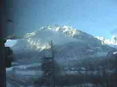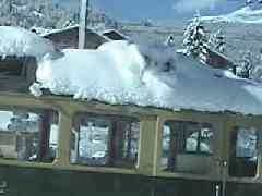 ホテルから登山電車の始発駅『グリンデルワルト』へ向かうバスの中から周囲を見ていると、山の雲が消えて行きます。でも、周囲の家々には1mも降ったと言う雪が積もっています。果たして登山電車は動くのでしょうか?