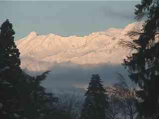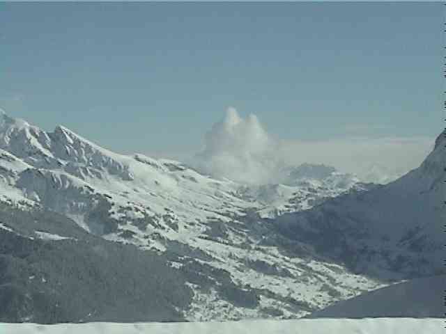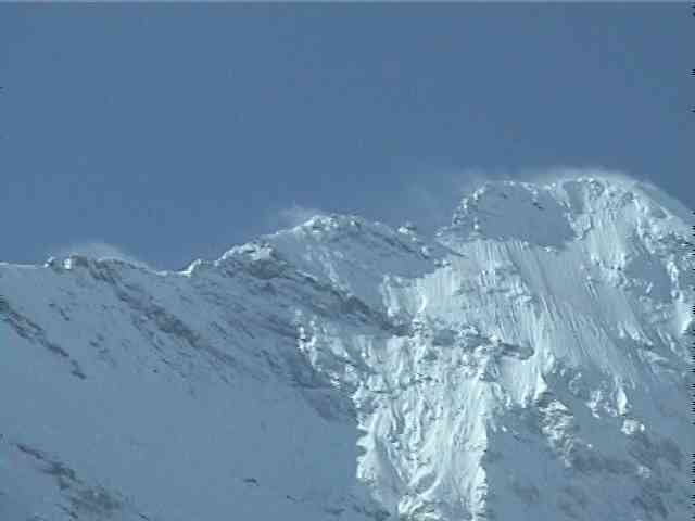 この山の上の部分をめいっぱい拡大してみると山の尾根を吹き抜ける風が作る雪煙の様な雲がかすかに見えます。