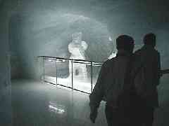 電車が頂上駅へ到着しました。頂上の展望台からまず4階へエレベーターで登り外へ出ます。外と言ってもそこは氷の中、つまり氷河の中なのです。氷河の厚さは7mと書いてあります。氷河のトンネルには氷を削った彫刻がいくつかありました。