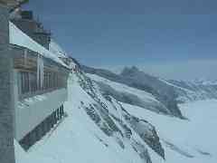 展望台の窓から見ると左にアイガー、中央に氷河が削った谷?、そして右手にユングフラウ?が見えます。振り返ると近くにメンヒがあります。しばらくこの景色を眺めていたいんですが、時間がありません。