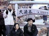 大涌谷の山頂駅でお昼を食べた後は歩いて標高1050mのイオウが噴出しているところへ行きました。ここで温泉卵(真っ黒なゆで卵)を食べて記念撮影をしました。