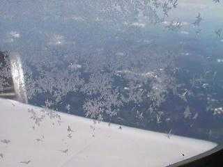 高度1万メートル気温マイナス40〜45度と言う低温のため窓には氷の結晶が付着しています。