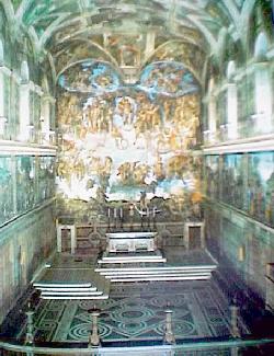 礼拝堂内部の写真を明るくして拡大すると右のようになります。天井までの高さは相当(20mくらい?)の高さがあります。写真では奥行きがありませんが手前の柵から正面の壁画(最後の審判)までも20〜30mあるのではないでしょうか?