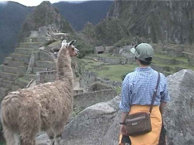 リャマと一緒に遺跡を見下ろして記念撮影。