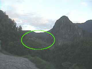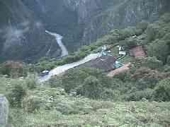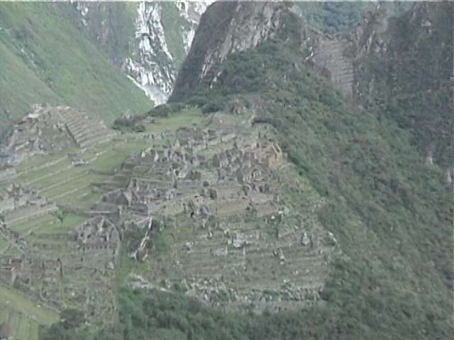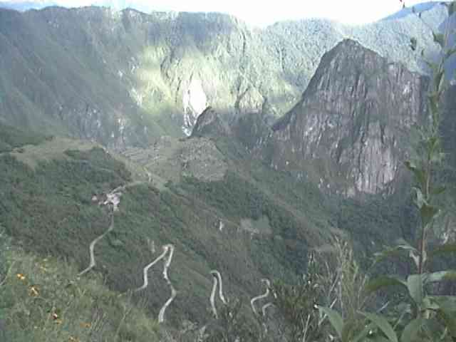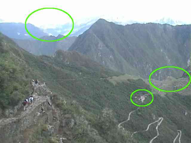 そして眼下にはマチュピチュの遺跡やワイナピチュの山、手前の緑の○は昨夜泊まったホテル、ホテルへ登ってくる曲がりくねった道が見えます。